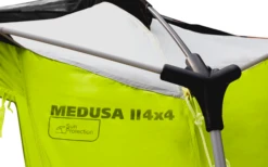 Bei dem Produkt handelt es sich um einen Outdoor Pavillon mit außenliegendem Stahl- und Fiberglasgestänge. Der Pavillon verfügt über zwei abnehmbare Seitenwände.
