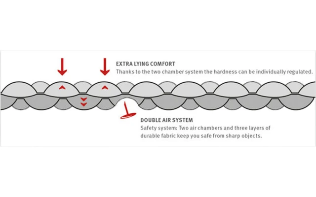 Das doppelte Luftkammersystem der COREO-Luftmatratze bietet Xtra- Komfort und Xtra-Schutz. Im Falle eines Lecks bleibt eine Luftkammer als Sicherheitsreserve erhalten. Die Luftmatratze COREO besteht aus einer punktgeschweißten Konstruktion aus ineinander verbundenen Kammern. Die Luftverteilung passt sich der Körperform an und sorgt fur eine ausgeglichene Liegeposition. Der Härtegrad der Matratze kann individuell reguliert werden, z.B. härter auf der Unterseite und weicher auf der Oberseite. Die vielen kleinen Luftpolster gleichen auch größere Bodenunebenheiten aus und bieten, dank der Mattenhöhe von 7,5 cm und einer Mattenbreite von 62 cm, einen hohen Schlafkomfort. Auf dem Rucken schlafenden Personen bietet sie genugend Liegefläche, um die Arme an den Seiten bequem abzulegen. Das Ober- und Unterseitenmaterial besteht aus einem robusten 40D Rip Stop Nylon mit einer TPU Beschichtung. Die Luftmatratze ist mit drei Kombinationsventilen ausgestattet, die ein Einlass- und ein Ablassventil enthalten. Ein Ventil befindet sich auf der Oberseite und eines auf der Unterseite der Matte. Das Kissen hat ein separates Kombiventil. Zu guter Letzt dient der Packsack auch als Pumpsack. Mit dieser cleveren Funktion ist die COREO Luftmatratze unschlagbar einfach im Gebrauch.